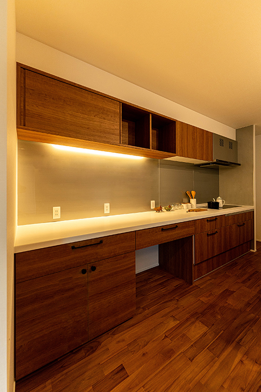 キッチンと同じチェリーの面材をカップボードにも使用し、一体化しているように制作。壁には不燃マグボードのソニックシルバーを使用した