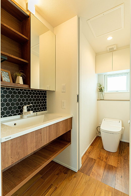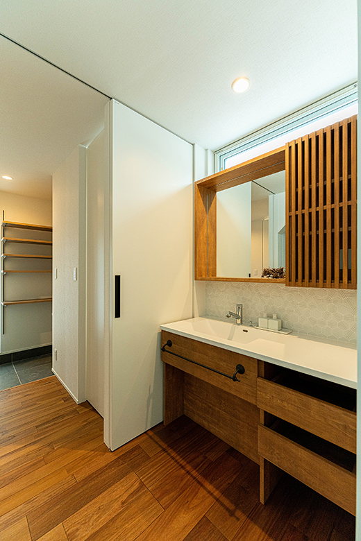 水回りには耐水性のあるパナソニックのアカシアクリアを使用。洗面台の引き出しは中が見えつつ、引き出しやすいように工夫している