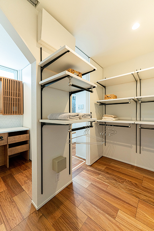 洗面台からファミリークローク、リビングへ。クローク側にロールスクリーンを設置し、来客時には見えないようにした