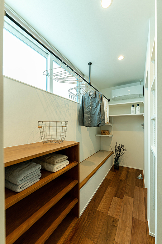 畳んだものを一時置いたり、お風呂上がりに涼んだりできるように、畳敷きのベンチを造作。洗濯物も乾かすことができ、季節問わず快適に過ごせるようにエアコンも取り付けた