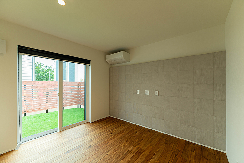 壁一面にエコカラットを取り付けた寝室。ここからも中庭を眺められる