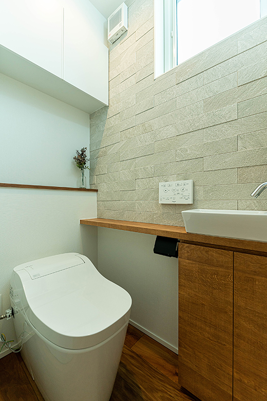 子どもたちのためのトイレと洗面。夫婦は平屋の生活、プラスアルファとして使うことができる