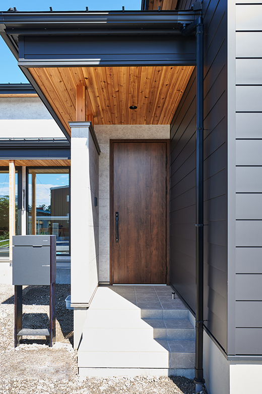 ブラックとグレーの異素材の外壁に、レッドシダーをアクセントに加えた外装