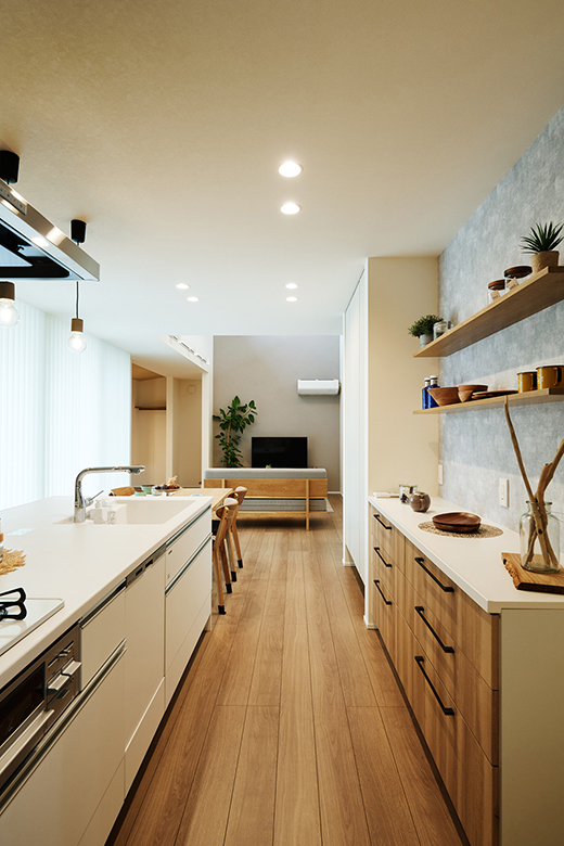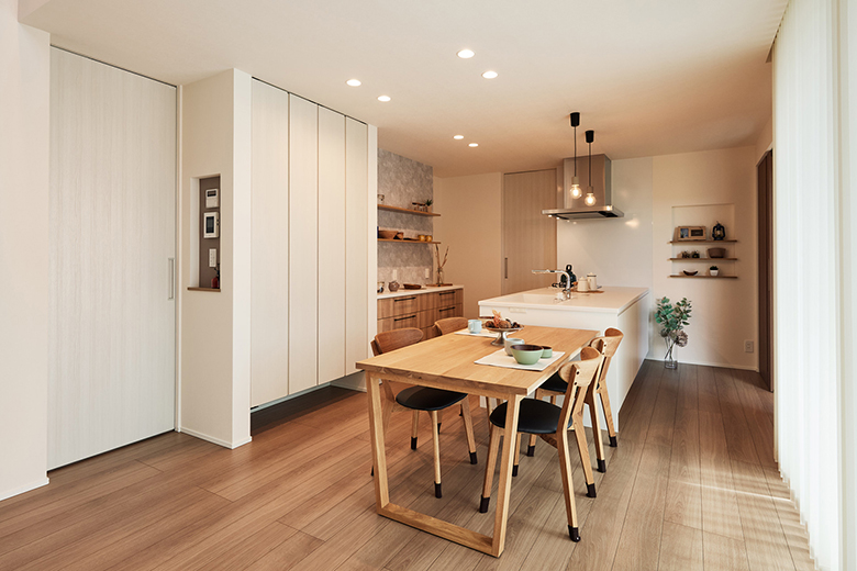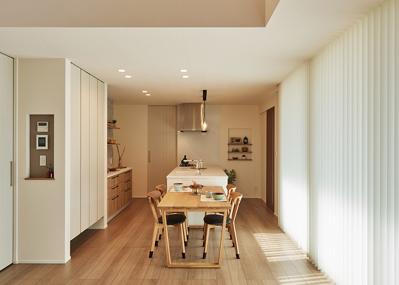 LDKはキッチン正面と横の2方向から出入りができる回遊動線