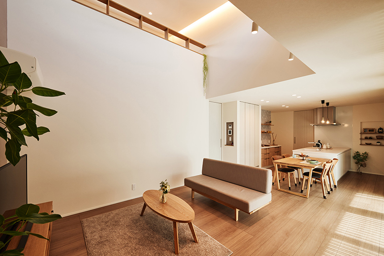 吹き抜けのある明るいリビング。そしてリビングを眺められるロフト。