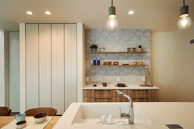 フラットキッチンの反対側は全面収納になっており、散らかりやすい小物もすっきりと片付く