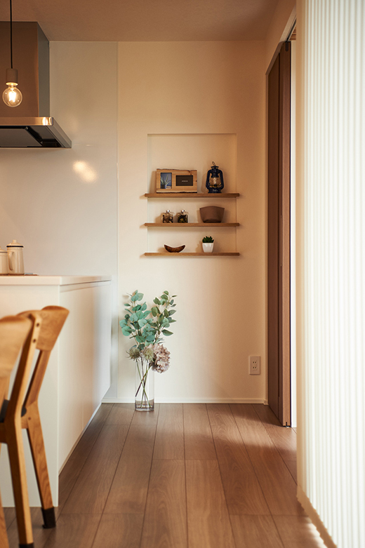 フォトフレームや季節の小物を飾ることのできるニッチ壁。一番上の段は磁石が付くマグネット壁仕様