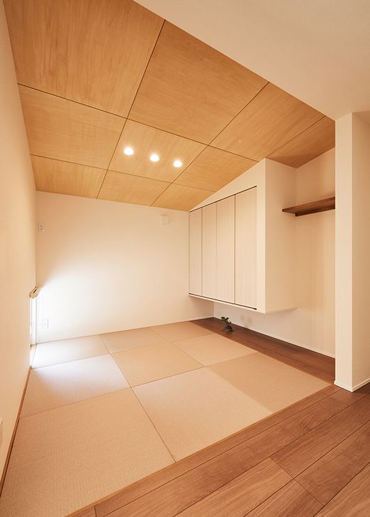 和室は勾配天井に優しい木目のベニヤ板を貼り、落ち着ける空間に仕上げた