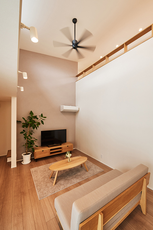 開放感のある吹抜けリビング。テレビ背面の塗り壁とロフトの木製の手摺がアクセント