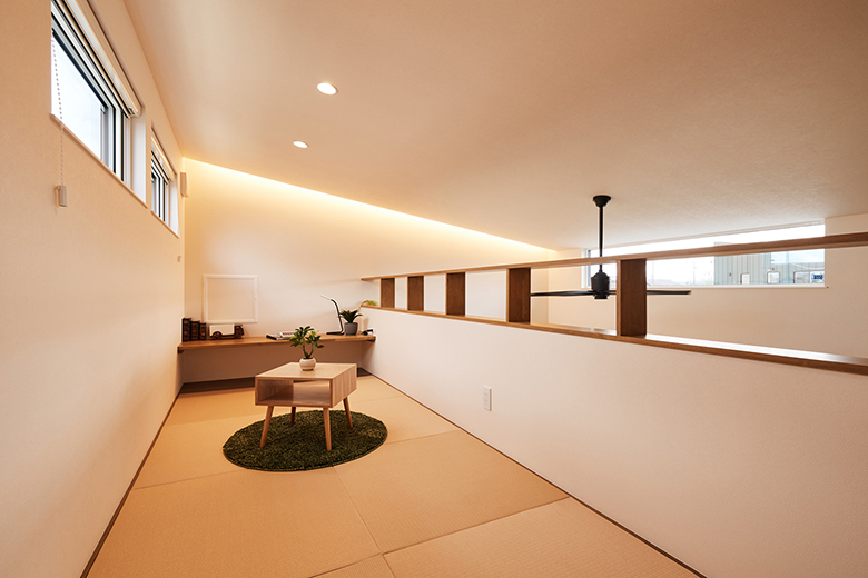 畳敷きのロフトは普段書斎として使用し、来客時は宿泊スぺースとして使用できる。腰壁の上部を木枠にし、窓の外に視線が抜けるよう設計