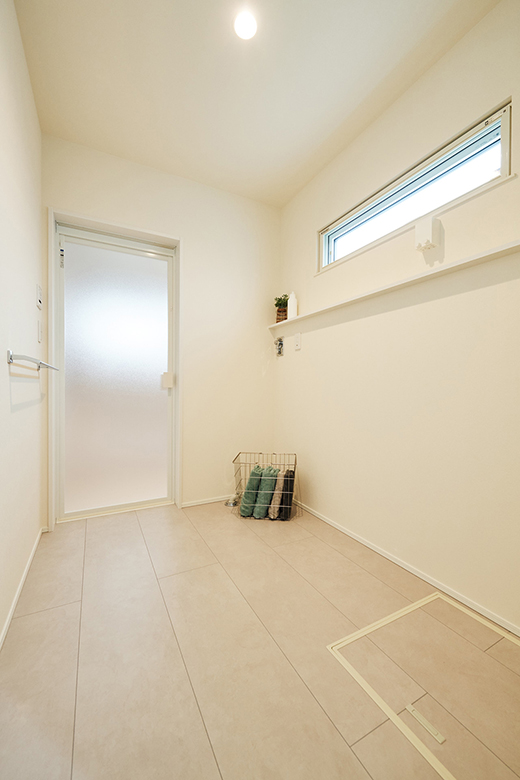 家族の衣類を一カ所に仕舞える大容量のファミリークローゼット。水回りに隣接して設け、衣類が乾いた後すぐに片付けることのできる家事楽な間取り