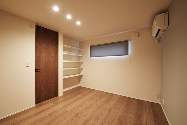 寝室には頭側になる壁に薄いグレーのクロスを貼り、部屋の一角に小物を片付けられる可動棚を設置した
