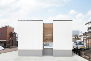無垢のチークの軒天と、窯業のOBOROがあいまって、ガルバリウムの無機質な印象とは異なり優しい素材感で来客をもてなす。斜めになっていることで広がりがある玄関ポーチ