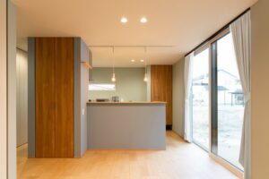 LDK全体を見渡せるようにキッチンを配置。明るい床に対して濃いめのグレーを差し色とし、空間を引き締める