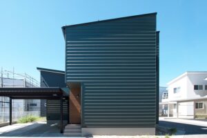 大きなFIX窓のある印象的な外観。黒のガルバリウムで窓の形に合わせたスクエアなフォルム