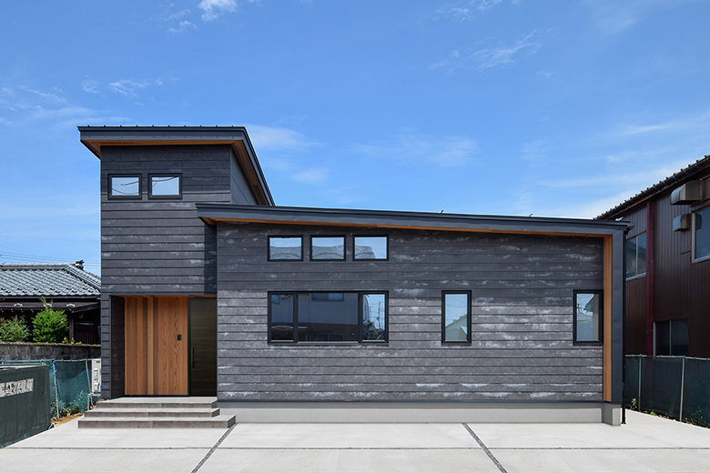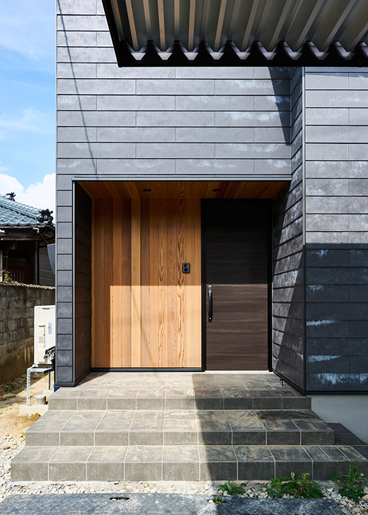 メインの外壁にSOLIDO、玄関ポーチと軒全体にレッドシダーを使い、男前なデザインに。全体的に無垢素材を使用しているため、経年変化を楽しめる