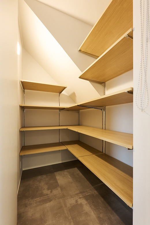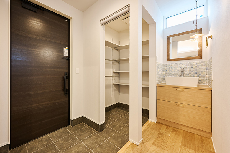 ただいま動線を意識し、玄関からのアクセスもいい位置にパントリーを設置。来客時はロールスクリーンでさっと隠せる