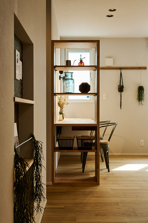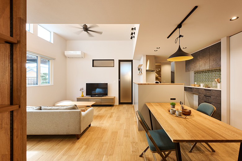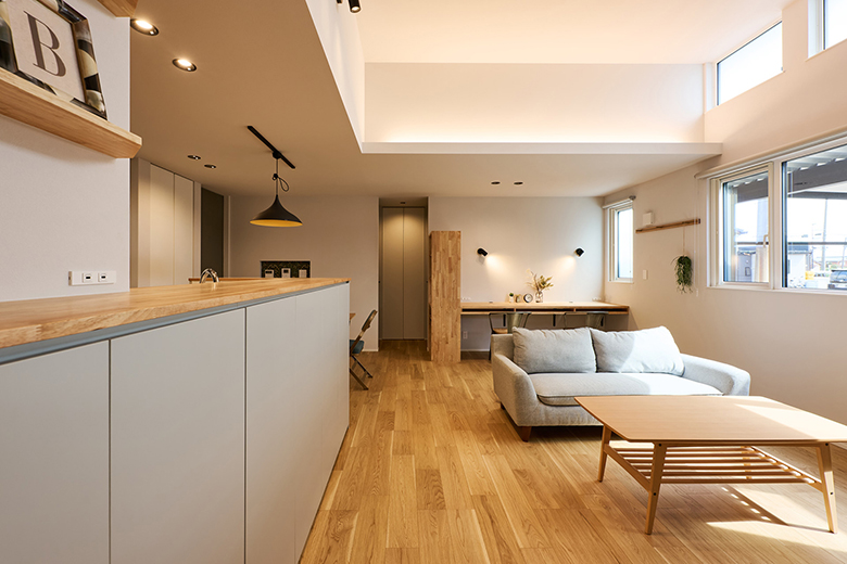 広さを確保したLDKに、腰壁収納や造作デスクを計画的に配置した機能的なレイアウト。