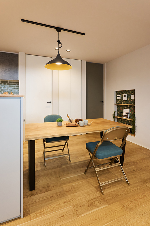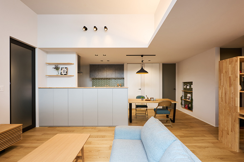 オーク・ホワイト・グレーを基調とした柔らかな空間に、照明や扉など、随所にアクセントとなるブラックを使用し、あたたかみと落ち着きのあるLDKとした。