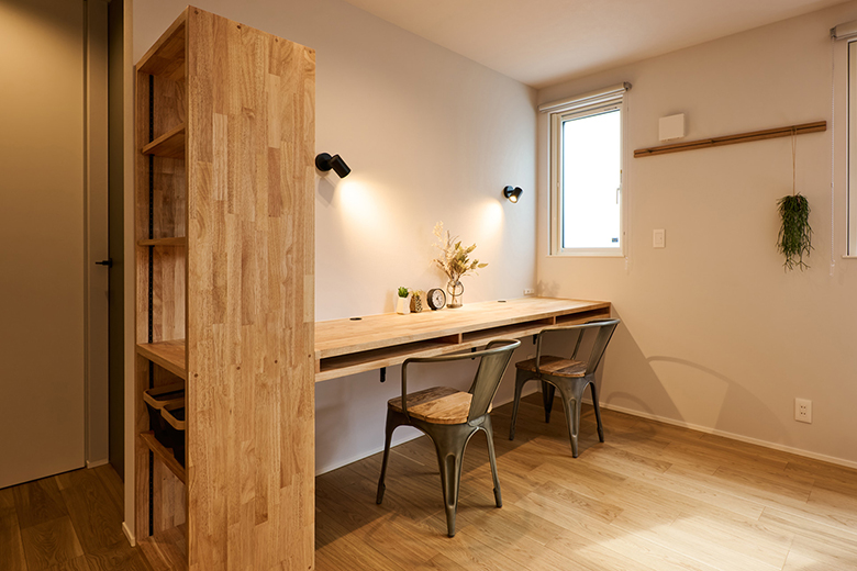 造作デスクと併設された収納棚。デスクや収納棚は用途を想定して、ミリ単位で造作している