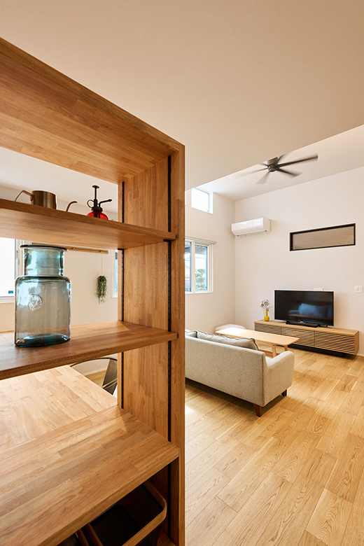 腰壁に併設した大容量収納。家族が過ごす時間の多いリビングには、みんなが共有して使えるように、収納スペースも多めに設置