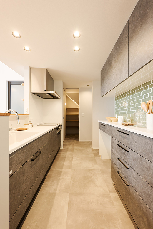 ベースカラーのひとつ、グレーを扉の色に選択。アクセントとしてグリーンのタイルを選んだ