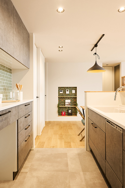 キッチンの腰壁は高めに設定し、リビング側からは手元を見えないように設計。床はモルタル調の塩ビタイルを使用している