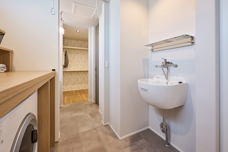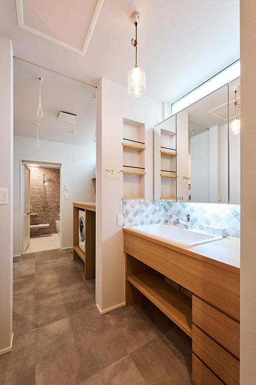 洗面スペースには見せる収納と隠す収納をバランスよく採用し、デザイン性と使い勝手を両立。