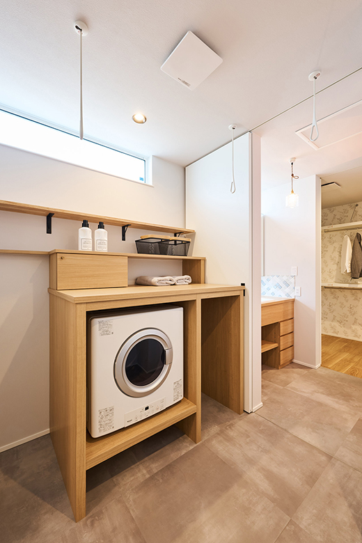 下にはルンバ基地、上には洗濯物をたためるスペースを併設した造作カウンター。乾太くん上部には配管隠しも