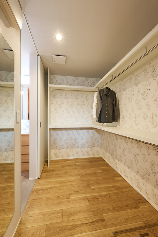 普段使う服や着替えをこちらのファミリークロークに。洗濯動線からつながる場所でもあるので、掛ける収納をメインに