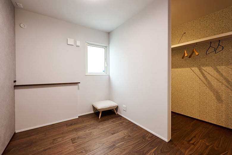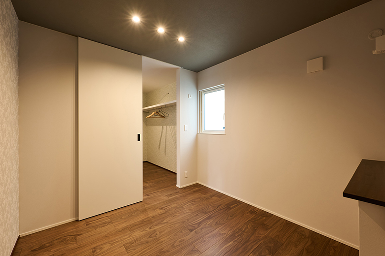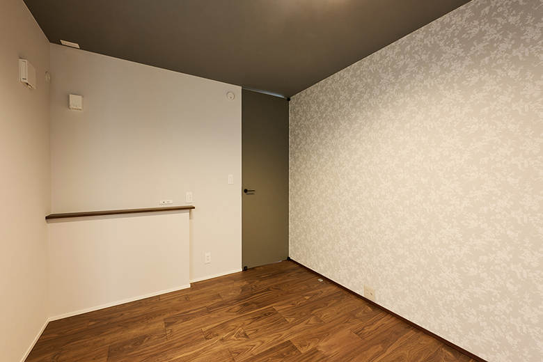 リビングからすぐに行けるご主人の寝室。アクセントには落ち着いたモルタル調のクロスを使用