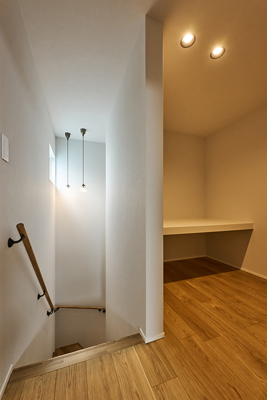 ロフトに続く階段。天井から吊るされたガラスペンダントもお施主様こだわりのものを