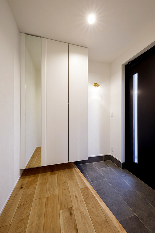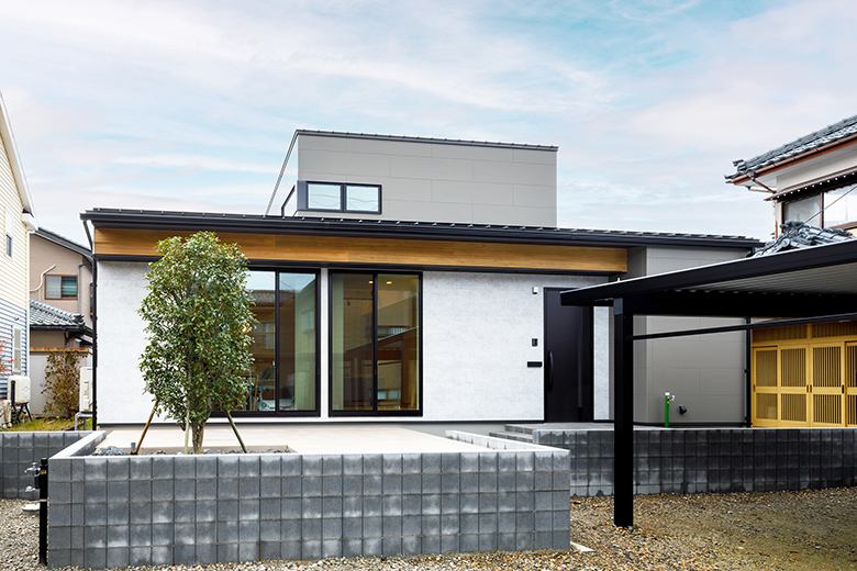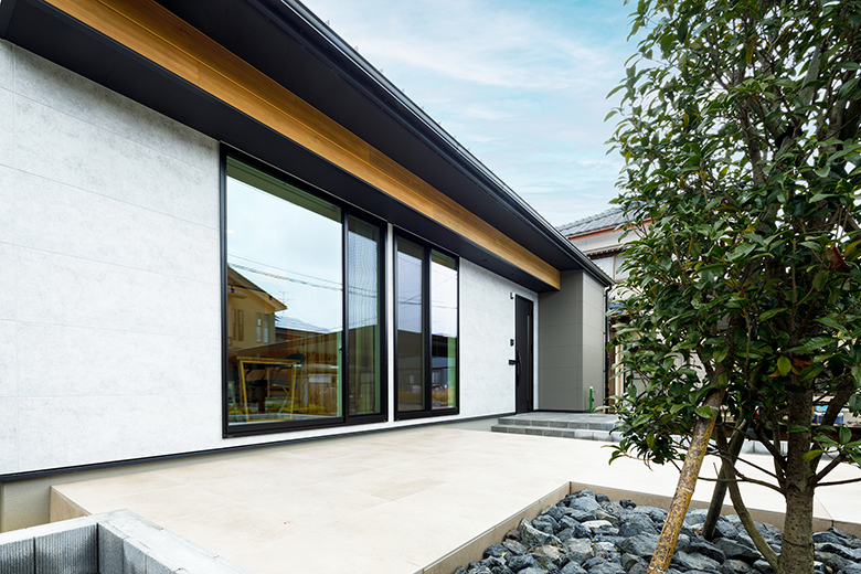 室内のベースカラーと合わせ、ホワイト・グレー・オークの3色でまとめ、内と外で統一感ある外観。