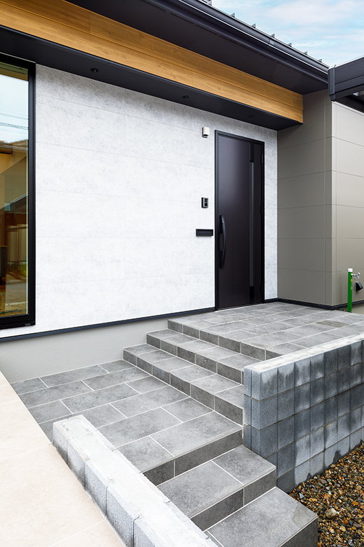 長方形のタイルがポイントの玄関ポーチ。踊り場・階段の幅を広くとり、敷地の高低差を利用したアプローチに仕上げた