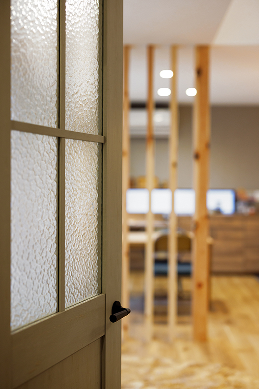 グリーンのカラーにアンティークガラスが可愛らしい雰囲気を醸し出すリビングドア