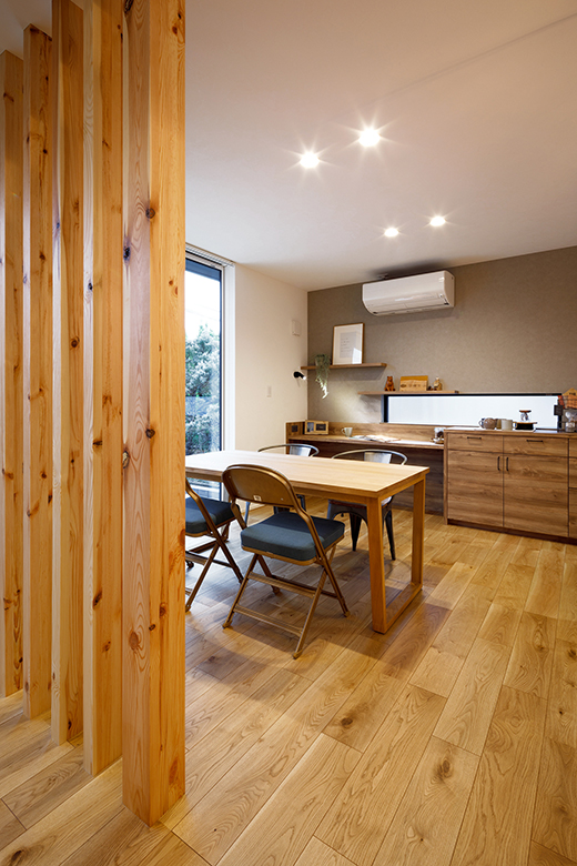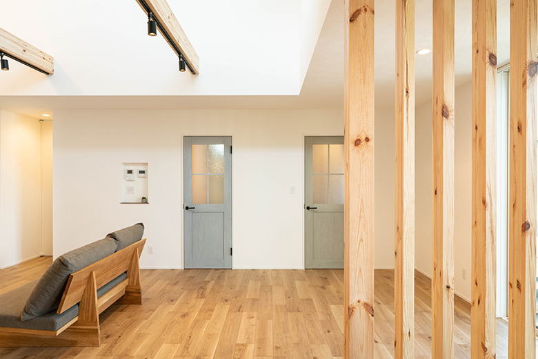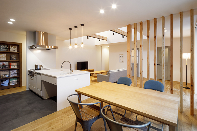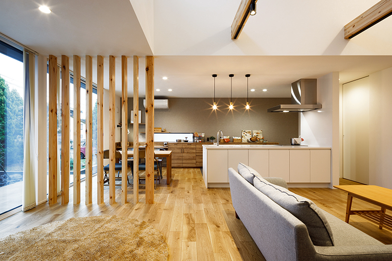 リビングとダイニングを隔てる格子がやんわりと空間をつなぐ28帖のLDK。ホワイト・グレー・オークの3色でまとめたナチュラルな内装