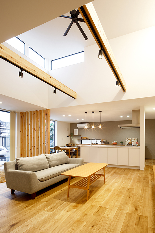 勾配天井と現し梁で、縦の広がりを演出したリビング空間。木の温もりとシンプルな美しさが調和する、心地よい暮らしの中心に