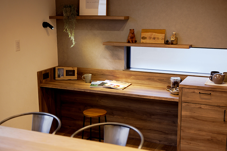 カップボードと一体の造作のカウンター。高さ違いに設置した飾り棚にはお気に入りの小物を飾る