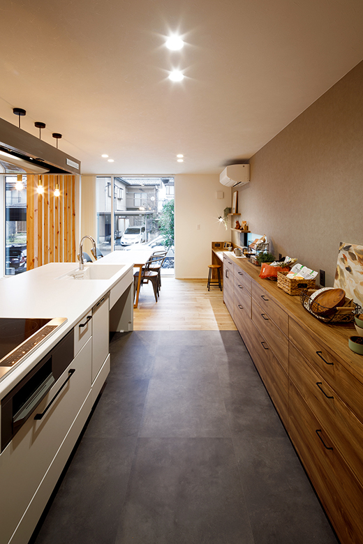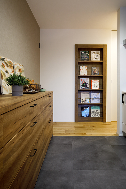 キッチンの床は水に強いフロアタイルを採用。背面の造作カウンターが、収納とディスプレイの両立を叶える