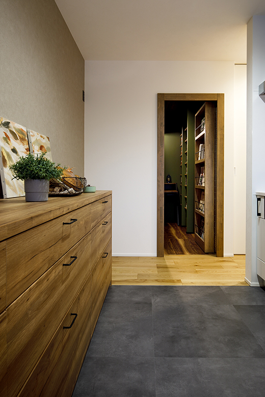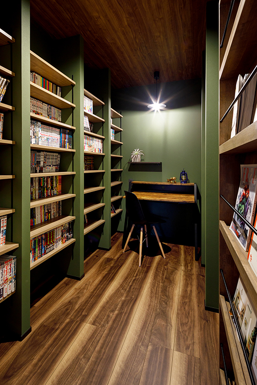 隠し扉の先はご主人の秘密基地。濃いカラーの床材・クロスでほかの部屋とガラッと雰囲気を変えた