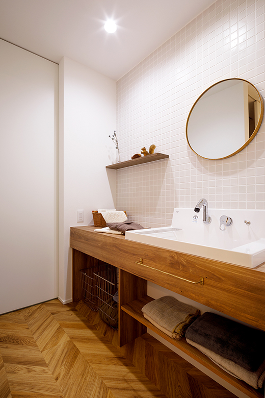 背面にあしらったホワイトの四角いタイルがレトロな雰囲気の洗面化粧台。ミラーの枠とタオル掛けの真鍮をアクセントに、飽きの来ないシンプルなデザインに仕上げた