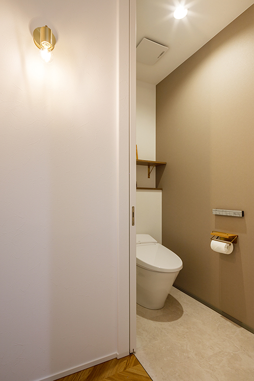 洗面室に隣接するトイレ。入り口付近のブラケットライトと棚の金物・紙巻き器の金物を真鍮色で統一