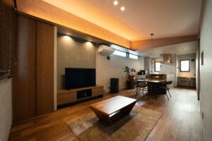 三条市|ブラックタイル×ウォールナットの床が魅せる、シックな23帖リビング|完成見学会【予約制】