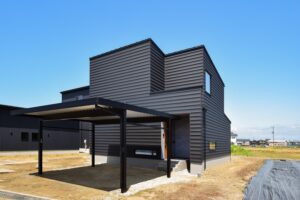 ブラックのガルバニウム鋼板とグレーの窯業系外壁のベストマッチ
