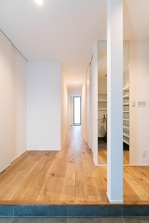 玄関を開けると目に入る広々としたホール。中庭まで貫く奥行きのある廊下が印象的
