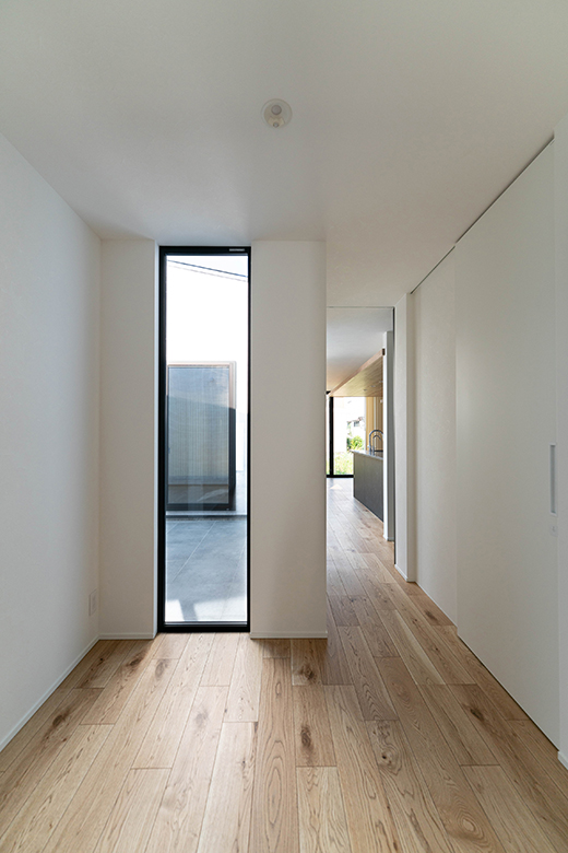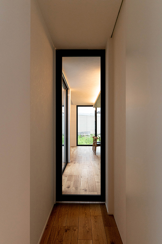 中庭のテラスが垣間見えるFIX窓は天井まであり、暗くなりがちな廊下を明るくしてくれる