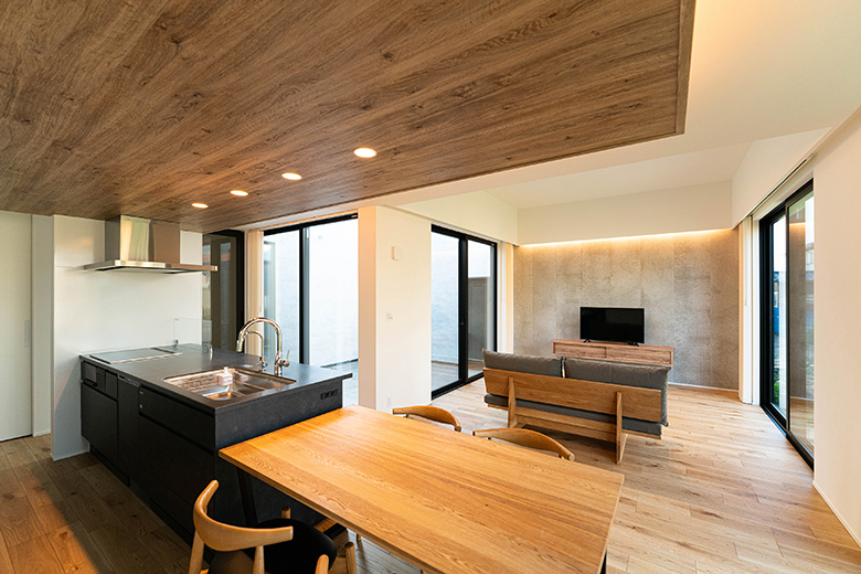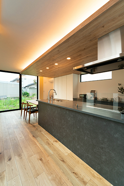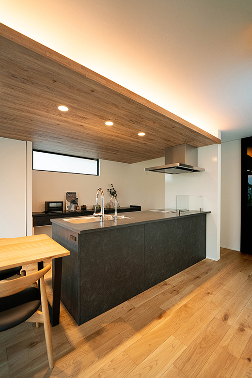 木目の下がり天井と間接照明に癒やされるダイニングキッチン