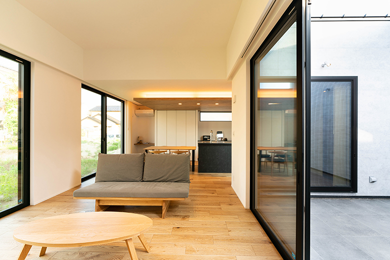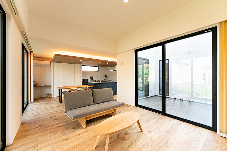 リビングから中庭へ向けた開口も広く、テラスと一体で使える