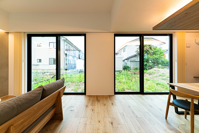 東に面した大開口のリビング。黒いサッシが空間を引き締める
