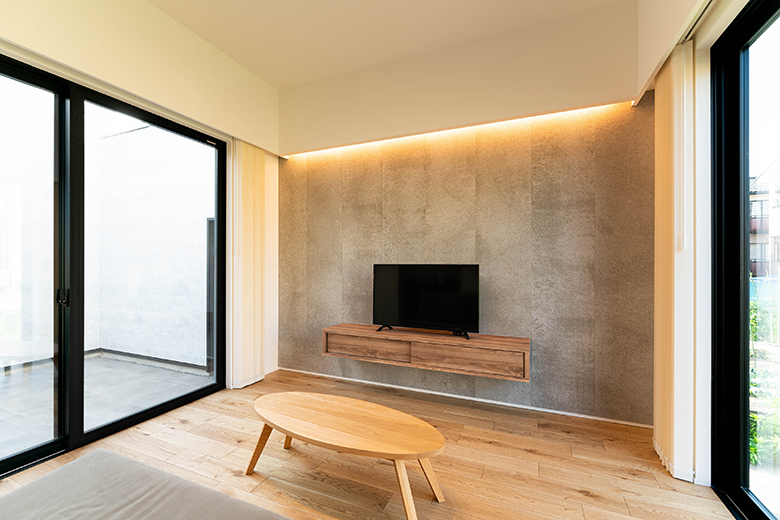石目調の壁に造作のフロートテレビボード。見た目にもスッキリして掃除もしやすい